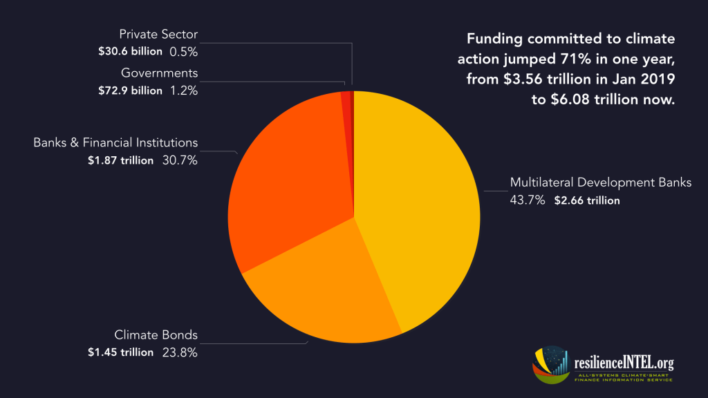 Between 2011 and the end of 2018, commitments of future funding to climate-smart priorities by major financial institutions across five sectors amounted to $3.56 trillion, with those commitments extending out to 2030. In 2019, that aggregate of climate-smart finance commitments expanded by 71%, to $6.08 trillion. (That 0.08 represents $80 billion.)